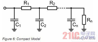 結(jié)構(gòu)函數(shù)可以進(jìn)一步轉(zhuǎn)變成簡化模型,也就是一個包含熱阻熱容的等效網(wǎng)絡(luò),它包含了結(jié)構(gòu)函數(shù)圖形中所包含的所有數(shù)值。圖6描述了類似功率LED等半導(dǎo)體元件的一個通用模型。當(dāng)然,實際的模型中R和C會有具體的數(shù)值。