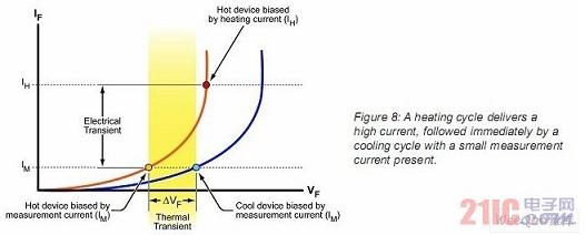 注意,當(dāng)PN結(jié)前向電流突然被停止(在測試過程中),不可避免的發(fā)生電瞬態(tài)現(xiàn)象。這個瞬態(tài)現(xiàn)象會持續(xù)很短的一段時間,在這段時間內(nèi)前向電壓的改變無法描述LED芯片的溫度的改變。因此,在進(jìn)行測量時必須給電瞬態(tài)現(xiàn)象消失留有一個時間上的延遲。