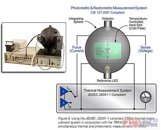 MentorGraphics公司MicReD部門的TERALED熱/輻射測量系統(tǒng)就是用于LED輻射和光度特性測量的。它的研發(fā)目的就是為剛才所提及的靜態(tài)測試提供完整的解決方案。當(dāng)將它連接到T3Ster系統(tǒng),TERALED可以完成熱瞬態(tài)測試,從而提供結(jié)構(gòu)函數(shù),簡化模型和熱特性數(shù)據(jù),同時也獲得光度特性數(shù)據(jù)。