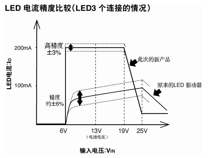 最近,汽車尾燈改裝LED燈的發(fā)展速度驚人,以低耗電量、長壽命這一優(yōu)點(diǎn)為背景,今后也將日益推進(jìn)汽車尾燈的LED化。此外,目前的LED尾燈是采用了10~20個(gè)LED發(fā)光二極管組成形式,但隨著LED的高亮度化和向普及型汽車的滲透, 減少LED發(fā)光二極管數(shù)量和其他器件用量的需求增高。在這樣的市場潮流中,即使是LED驅(qū)動(dòng)器IC,對(duì)高精度化,高功率方面的需求也越來越高。因此,急需開發(fā)出車載尾燈用高性能LED驅(qū)動(dòng)器。此次羅姆開發(fā)的尾燈專用LED驅(qū)動(dòng)器IC, 因確保了200 mA的輸出電流,與以往的LED驅(qū)動(dòng)器相比,輸出電流增加了3~5倍左右,從而使LED的高亮度化成為可能。另外,由于大幅改善了輸出電流精度,增大了LED誤差的容許范圍,尾燈組裝工序的成品率大幅改善。再有驅(qū)動(dòng)方式采用了源驅(qū)動(dòng)方式,驅(qū)動(dòng)IC電路板與LED電路板的結(jié)線,與以往的同步驅(qū)動(dòng)方式的2處相比,削減到1處后, 可以很容易實(shí)現(xiàn)車載用途所要求的開/短路檢測。再有,尾燈點(diǎn)燈時(shí)和剎車燈點(diǎn)燈時(shí)的亮度(電流量)可以自由設(shè)定的獨(dú)立電流設(shè)定等,在很大程度上方便了車載尾燈的設(shè)計(jì)。由P-BUS功能及LED開/短路檢測保護(hù)功能得以實(shí)現(xiàn)的故障安全功能也更加充實(shí)。