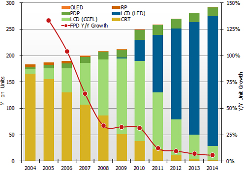 - 預(yù)計(jì)總體液晶電視出貨量將穩(wěn)步增長,到2014年達(dá)到2.7億臺(tái)