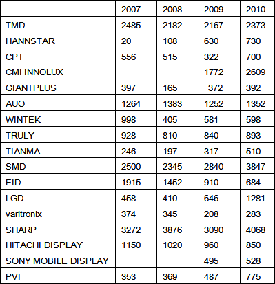 最后,中小顯示屏行業(yè)在一年內(nèi)也經(jīng)歷了比較大的變動。華映(CPT)和彩晶(HANNSTAR)徹底轉(zhuǎn)型為中小顯示屏廠家。CPT在2010年出貨量高達(dá)3.52億片,比2009年增長135%;HANNSTAR在2010年出貨量高達(dá)2.48億片,比2009年增長505%。雖然出貨量大增,但是平均單價(jià)不高,毛利低。加上TFT-LCD生產(chǎn)線的高額折舊費(fèi)用,這兩個(gè)廠家還處于虧損的泥潭之中。