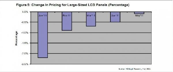 上圖所示為IHS iSuppli公司對1-5月大尺寸LCD面板價(jià)格變動(dòng)的逐月預(yù)測。大尺寸LCD面板是指對角尺寸從10.1到55英寸以上的面板。