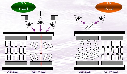 在TV產(chǎn)品中已經(jīng)得到大范圍應(yīng)用的VA面板,以其能與IPS屏相抗衡的178°超廣視角聞名。此次明基使用的AMVA面板來源于MVA面板,這種技術(shù)是垂直取向陣營的代表,最早由富士通公司開發(fā),并且由此衍生出了Super-MVA(奇美采用)和MVA-Premium(富士通、友達光電采用,近期SHARP合并富士通的LCD部門后也獲得該技術(shù))。在MVA技術(shù)中,其液晶分子的長軸在未加電時不像傳統(tǒng)TN模式那樣平行于屏幕,而是垂直于屏幕,并且每個像素都是由多個這種垂直取向的液晶分子疇組成。當(dāng)電壓加到液晶上時,液晶分子向不同的方向偏轉(zhuǎn),這樣從不同的角度觀察屏幕都可以獲得相應(yīng)方向的補償,也就改善了可視角度。