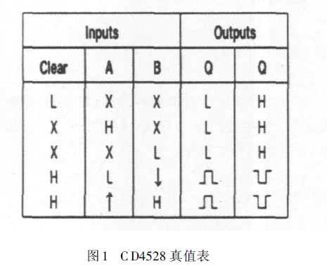 CD4528含兩個(gè)單穩(wěn)態(tài)觸發(fā)器,其真值表如圖1。芯片3腳與13腳分別為其內(nèi)部?jī)蓚€(gè)獨(dú)立單穩(wěn)態(tài)電路的Clear 端,5腳和11腳為單穩(wěn)態(tài)的B輸入端,4腳與12腳為單穩(wěn)態(tài)的A輸入端。B端接高電平,只有當(dāng)Clear端為高電平時(shí),A端輸入的上升沿觸發(fā)才會(huì)有效。