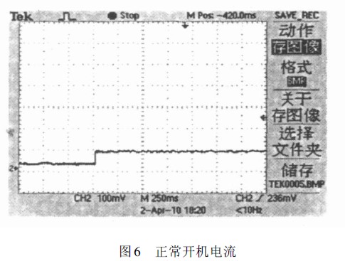 開(kāi)機(jī)時(shí),由于電源濾波電容大,以及各延遲環(huán)節(jié)使得電流采樣反饋值與給定值在調(diào)節(jié)器輸入端不同,這會(huì)使得負(fù)載電流上升過(guò)沖,實(shí)測(cè)過(guò)沖波形如圖5所示。 為了解決這一問(wèn)題,可以將調(diào)節(jié)器給定端RC 的值適當(dāng)加大,調(diào)節(jié)以后的開(kāi)機(jī)電流沒(méi)有發(fā)生過(guò)沖,波形如圖6.