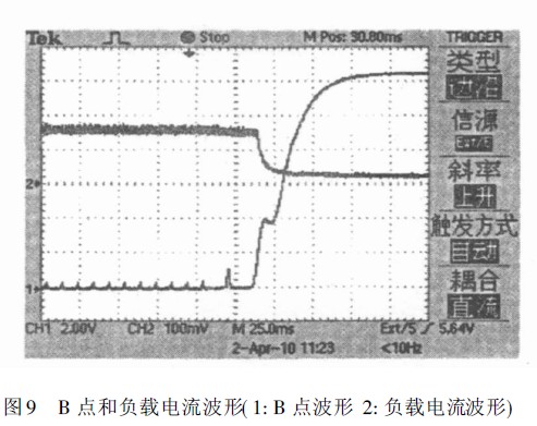 光耦U1、U 2 隨被測(cè)電源的正負(fù)半周交替導(dǎo)通,當(dāng)A 點(diǎn)交流電壓大于光耦中發(fā)光二極管的導(dǎo)通電壓Von時(shí),光耦開(kāi)啟,C3通過(guò)光耦中三極管放電,使B 點(diǎn)的電壓達(dá)不到場(chǎng)效應(yīng)管的開(kāi)啟電壓; 當(dāng)交流電壓小于Von時(shí),光耦不導(dǎo)通,C3充電,B點(diǎn)的電壓增加,此時(shí)應(yīng)使C3的電壓上升到場(chǎng)效應(yīng)管閾值的時(shí)間大于光耦關(guān)閉的時(shí)間,以保證Q2不導(dǎo)通。 在t1時(shí)刻交流電源斷開(kāi),光耦輸出呈高阻態(tài),C2中存儲(chǔ)的電荷經(jīng)R1向C3充電,C3上的電壓迅速增加,當(dāng)B點(diǎn)電壓大于場(chǎng)效應(yīng)管的開(kāi)啟電壓時(shí),場(chǎng)效應(yīng)管Q2導(dǎo)通,導(dǎo)通后可迅速將Vs 拉低,圖8中Vs是調(diào)節(jié)器的給定輸入端電壓。 關(guān)機(jī)瞬間負(fù)載電流和圖8中B點(diǎn)的波形如圖9。改變R1和R4的參數(shù),可以改變給C3充電的時(shí)間。 R4選用較大阻值的,可以提高C3上的電壓,同時(shí)延長(zhǎng)C3的放電時(shí)間。 C2的大小可以決定交流電源斷電后維持該電路工作的時(shí)間。 綜上所述,設(shè)置合理的參數(shù),便可保證在主電路電源沒(méi)有完全關(guān)閉的情況下,Q2一直導(dǎo)通,即誤差放大器的給定輸入端一直為零,避免了電流過(guò)沖。