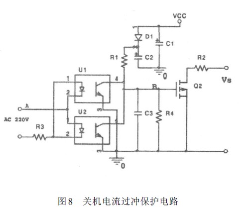 圖8 為關(guān)機(jī)電流過(guò)沖保護(hù)電路,該電路能在3ms內(nèi)迅速檢測(cè)出交流電源是否關(guān)閉,并且在電源關(guān)閉后強(qiáng)行將調(diào)節(jié)器給定輸入端的電壓拉低,防止電流過(guò)沖,具體動(dòng)作過(guò)程如下。