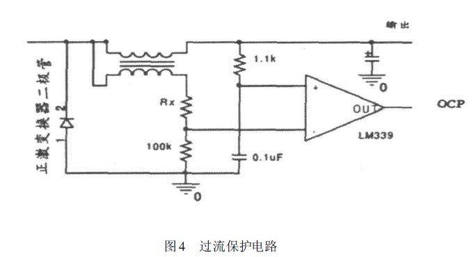 這里采用如圖4的方法,在正激變換器扼流圈放置相同匝數(shù)的線徑較細(xì)的線圈。 這兩個(gè)繞組是磁平衡的,它們之間本應(yīng)沒(méi)有電壓差。 但是主繞組有直流電阻,大電流時(shí)產(chǎn)生了微小的電壓差,該電壓差由負(fù)載電流決定。這個(gè)微小的電壓差被運(yùn)放檢測(cè),并且通過(guò)調(diào)節(jié)Rx可以設(shè)置電流限制。該電路的缺點(diǎn)是電流限制不是很精細(xì)的,這是因?yàn)殂~電阻在溫度每上升10℃時(shí)增加4%。但是這個(gè)電路依然可以滿足我們的設(shè)計(jì)要求。