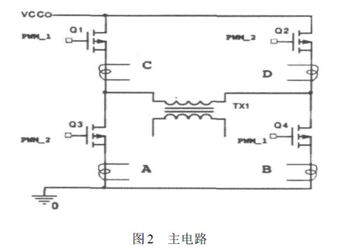 PWM1與PWM2為PWM芯片輸出的兩路互補(bǔ)脈沖信號(hào),主電路(見(jiàn)圖2)中Q1、Q4的驅(qū)動(dòng)與圖3中PWM1同步,Q2、Q3的驅(qū)動(dòng)與PWM2同步。 在A、B、C和D4點(diǎn)進(jìn)行電流上升率采樣然后轉(zhuǎn)變?yōu)殡妷盒盘?hào),并分別給圖3中的直通信號(hào)1與直通信號(hào)2。