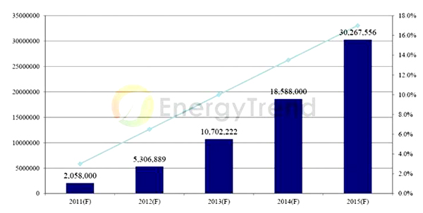 目前,臺灣的臺達電、光寶的力銘等廠商看好微型逆變器前景,投入微型逆變器研發(fā)生產(chǎn),雖然目前微型逆變器市場仍小,但成長空間極大。EnergyTrend預(yù)估微型逆變器的滲透率在2011年可提升至3%,在2015年可達15%~20%。