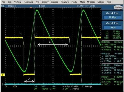 圖3 詳細(xì)地示意了LED驅(qū)動器在一個完整交流電周期內(nèi)Q3的漏源電壓和電流情況。