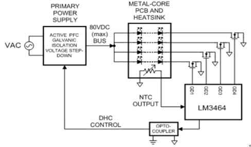 此外,本文還將給出另外一種實現(xiàn)方法的結(jié)構(gòu)示意圖,即采用隔離式AC/DC電源及一款具有動態(tài)余量控制的LM3464。通過避免電磁干擾,該方案具有極高效率。