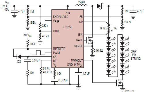 大多數(shù)前燈應(yīng)用需要約 50W LED 電流。凌力爾特公司的 LT3755 設(shè)計成服務(wù)于這種類型的應(yīng)用。它可以將汽車總線電壓(標(biāo)稱值為 12V)提高到 60V,以驅(qū)動多達 14 個串聯(lián)連接的 1A LED,如圖1所示。