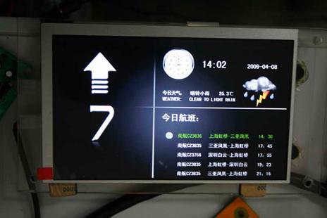 傳統(tǒng)的電梯外呼板采用點陣LED或黑白液晶顯示,顯示效果單調(diào),而采用TFT液晶顯示,不但亮度高,而且可以顯示彩色圖片及文字,顯示效果美觀,此外還可以根據(jù)需要顯示一些廣告、通知等信息,是為未來的發(fā)展方向。