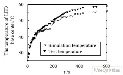 LED 從開(kāi)始工作到穩(wěn)態(tài)過(guò)程中,基板測(cè)點(diǎn)溫度變化曲線和仿真結(jié)果如圖3 所示,升溫過(guò)程中,實(shí)測(cè)結(jié)果略低于仿真結(jié)果,到達(dá)穩(wěn)態(tài)后,兩則相差2.9℃,驗(yàn)證了有限元分析的可靠性。材料參數(shù)的誤差、仿真過(guò)程中忽略了熱輻射以及將對(duì)流作為簡(jiǎn)單邊界條件施加是產(chǎn)生誤差的主要原因。