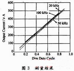 圖4為在PWM調(diào)光模式下外加PWM脈沖驅(qū)動信號和輸出驅(qū)動電流的測量結(jié)果。PWM占空比從0~100%。從圖中可以清楚的看到,通過改變不同的PWM占空比可以調(diào)節(jié)額定電流,PT4115最大能夠輸出1.2 A的電流。
