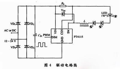 這里采用LED驅(qū)動芯片PT4115。PT4115是一款連續(xù)電感電流導通模式的降壓恒流源IC,能將直流電壓直接轉(zhuǎn)換成穩(wěn)定的恒流輸出。