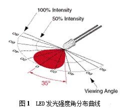 LED的發(fā)光強度隨觀察角度的變化而變化,從不同角度觀察LED發(fā)光管,它的發(fā)光強度有很大差別。發(fā)光強度的大小由LED發(fā)光管自身的發(fā)光強度角分布曲線決定,其分布曲線如圖1所示。LED光軸方向相對發(fā)光強度(即發(fā)光強度與最大發(fā)光強度的之比)為1,即發(fā)光強度最大。離開光軸方向的角度越大,相對發(fā)光強度越小。由圖1可以估算出該LED的半值角,視角值為。