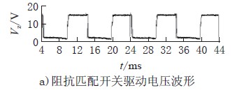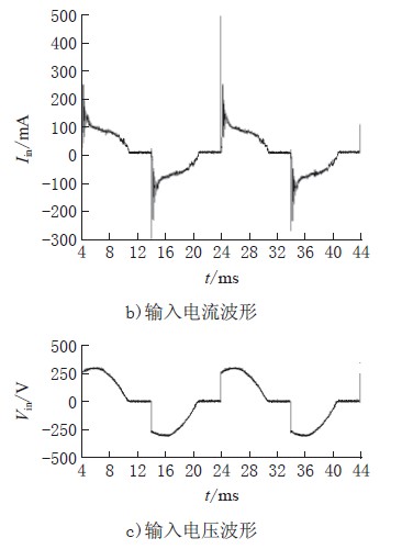 圖4a)、b)、c)為可控硅導(dǎo)通角為115°時(shí)阻抗匹配開(kāi)關(guān)驅(qū)動(dòng)電壓VZ、輸入電流Iin、輸入電壓Vin的波形,電路的輸出電流為470mA,功率因數(shù)為0.78。從圖中可看出,當(dāng)可控硅導(dǎo)通瞬間,由于驅(qū)動(dòng)器輸入端有差模濾波電容導(dǎo)致輸入電流有沖擊電流尖峰,而當(dāng)輸入電流小于一定值時(shí),阻抗匹配開(kāi)關(guān)開(kāi)通以保證流過(guò)可控硅的電流大于其維持電流。