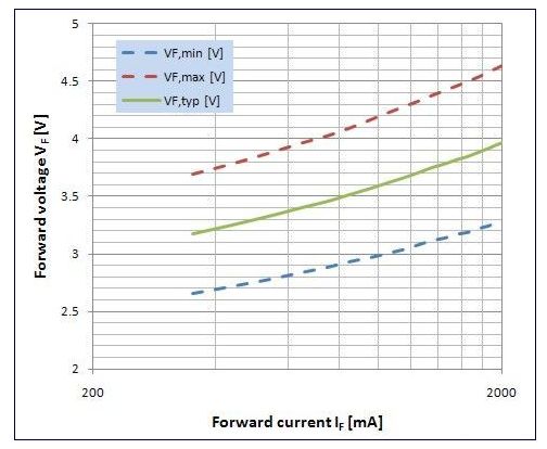 移動電話中閃光燈 LED 的高正向電壓和電流以及給定的電池電壓,讓升壓轉(zhuǎn)換器成為最佳的解決方案。驅(qū)動大電流時,基于電感的升壓轉(zhuǎn)換器呈現(xiàn)出令人滿意的效率。LED 必須為電流驅(qū)動,因為正向電壓不僅僅隨溫度而變化,而且也有其自身的差異。正向電壓的這種變化源自于其生產(chǎn)過程,其變化范圍為 ±20%,請參見圖 1。