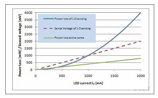 圖 4 顯示了使用一個 1Ω 電阻檢測電流和使用一個調(diào)節(jié)至 400mv 壓降的有源電流檢測方法之間的比較情況。受益于低功耗,有源電流檢測方法明顯有助于更高的系統(tǒng)效率。