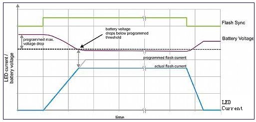 如果閃光燈驅(qū)動器本身能夠防止電池電壓下降過多,那么就可以保持較小的安全界限。通過使用一個受控轉(zhuǎn)換率升高 LED 電流,并在上升期間持續(xù)監(jiān)控電池電壓可以實現(xiàn)這一目標(biāo)。