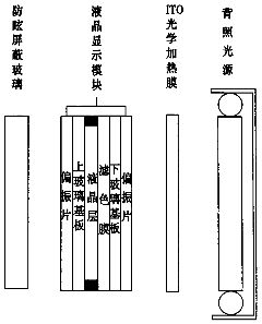將ITO 膜加熱玻璃放置在液晶屏前面(見圖1) ,通過對ITO 膜加電發(fā)熱,從而加熱液晶屏及其背光源。這種加熱方式的加熱速度、效率都比較低,對顯示器的低溫啟動時間存在一定的制約,因為加熱玻璃的功率不能制得太大,若功率太大對液晶屏的溫度沖擊有可能將其破壞。這種方法雖然存在一定的局限性,但由于其工藝簡單,易于實現(xiàn),國內(nèi)大部分廠家目前還是采用這種加熱方式。