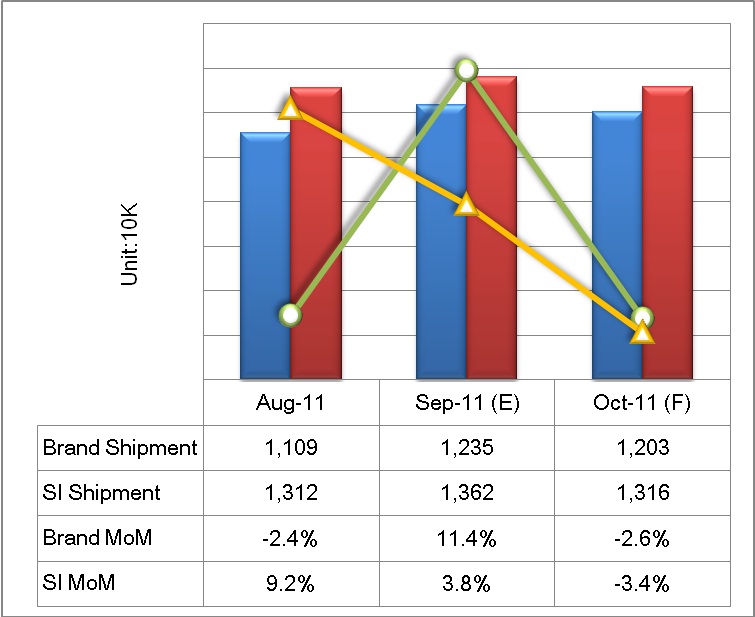 WitsView表示今年液晶顯示器年成長將呈現(xiàn)持平狀態(tài),全年預估出貨約為168M(臺)。另外,預估AIO出貨量約為12~12.5M左右,由于今年全球景氣受到歐洲債務危機延燒沖擊,整體市場規(guī)模有限,各品牌廠商截至目前為止出貨量距離全年目標尚有一段距離,再加上歐美市場需求疲軟,因此各品牌廠商將集中于中國十一長假期間放手一搏,透過強力降價促銷以把握機會沖刺,以爭取全年市占率。