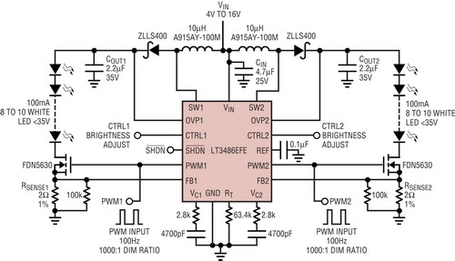 就夜間觀看極亮的顯示器而言,LT3486以其獨特的內(nèi)部PWM調(diào)光架構(gòu)提供1000:1的PWM調(diào)光比。內(nèi)部LED電流存儲器具有超快PWM響應(yīng)時間,可以低于10us的時間讓LED電流從零返回到100mA,以實現(xiàn)真彩PWM調(diào)光。在高端顯示器中用兩個LT3486驅(qū)動分別代表紅、綠、綠、藍(R-G-G-B)的4個LED串,可實現(xiàn)1000:1的調(diào)光比,并在非常暗的夜間工作環(huán)境保持顯示器的真彩特性。