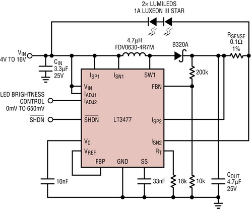 圖3所示的LT3477降壓-升壓型LED驅(qū)動器以1A電流驅(qū)動兩個大功率LED。這兩個LED無需以地為基準,連接的兩個端子一般是轉(zhuǎn)換器的輸出和電池輸入。LT3477有兩個獨特和具100mV浮動電流檢測輸入引腳,這引腳連接與LED串串聯(lián)而且不以地為基準的電流檢測電阻。在汽車電池的工作電壓范圍內(nèi)以及低于這個范圍時,在電流直到1A的情況下都可實現(xiàn)準確的LED穩(wěn)流。LT3477的停機引腳用于實現(xiàn)車燈的接通/斷開功能,并在未使用時將輸入電流降低到1uA(典型值為100nA)。IADJ引腳用來為后部信號指示燈或剎車燈等剎車燈和尾燈應(yīng)用實現(xiàn)高于10:1的模擬調(diào)光比。這類應(yīng)用無需真彩PWM調(diào)光。