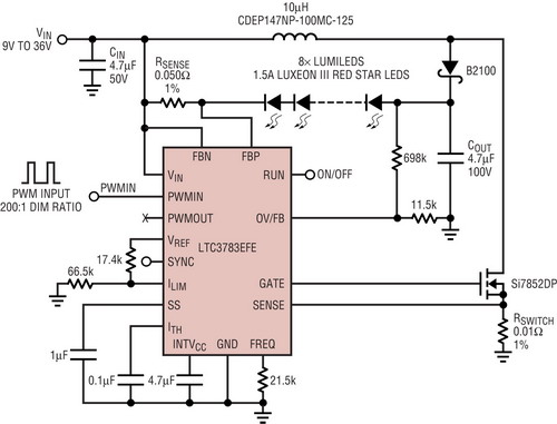 如圖4所示,大功率LED驅(qū)動器LTC3783采用降壓-升壓型拓撲,驅(qū)動6至10個3W紅光LED,用于汽車尾燈應(yīng)用。外部開關(guān)MOSFET和開關(guān)電流檢測電阻為大功率和高壓LED驅(qū)動器設(shè)計提供了最大的設(shè)計靈活性。如果電池電壓降至低于9V,那么9V至36V輸入和在電流為1.5A時高達25V的LED串輸出需要100V的額定開關(guān)電壓和高于8A的峰值開關(guān)電流能力。在整個汽車電池電壓范圍內(nèi),1.5A恒定電池電流是良好穩(wěn)定的。就剎車燈和尾燈調(diào)光而言,在100Hz時,可以用直接連接到LTC3783PWM引腳的PWM信號降低LED電流,以實現(xiàn)高達200:1的調(diào)光比。在1kHz時,調(diào)光比降低至?20:1,這對尾燈應(yīng)用來說已足夠了。調(diào)節(jié)ILIM引腳也可以降低LED電流。