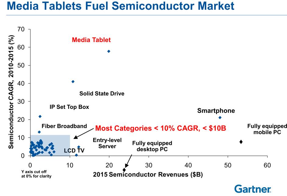 在這107項(xiàng)被調(diào)查的產(chǎn)品中,幾乎絕大多數(shù)在未來5年內(nèi)的半導(dǎo)體產(chǎn)值都在100億美元以內(nèi)(上圖左下角藍(lán)色部份)。而接下來的幾年,扮演推動(dòng)半導(dǎo)體成長(zhǎng)重任的產(chǎn)品,將從PC轉(zhuǎn)移到平板計(jì)算機(jī)、智慧手機(jī)和固態(tài)硬盤(SSD)身上。