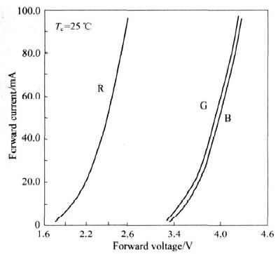 從圖2 的IF 與L 曲線可知, IF 的大小直接影響了L 。當(dāng)IF 達(dá)到一定值以后,L 基本趨于飽和。根據(jù)圖1 和圖2 的VF 、IF 和L 特性,在實(shí)際中通常用VF 的方式驅(qū)動(dòng)LED ,用串連電阻值的大小調(diào)整LED 的RGB 三基色的IF 使其L 一致。而系統(tǒng)對(duì)RGB 三基色的IF 的調(diào)整,是以常溫為基本的標(biāo)準(zhǔn)。