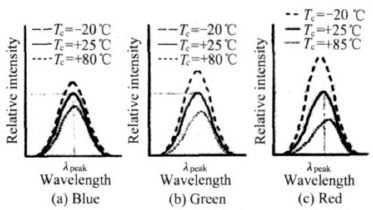 但從LED 的亮度特性圖3 可知,隨著環(huán)境溫度TC 的變化,L ED 的RGB 三基色的顯示亮度偏移狀況各不相同,B 的飄移較小,而R 的飄移較大,當(dāng)溫度超過(guò)80 ℃時(shí),R 相對(duì)亮度的變化幾乎是常溫時(shí)的2 倍。這種變化完全破壞了常溫時(shí)設(shè)置的白平衡,使整個(gè)顯示屏的色度發(fā)生嚴(yán)重漂移,圖像質(zhì)量變差。RGB 三基色的相對(duì)亮度的偏移如圖4 示,可明顯看出,常溫時(shí)三基色的亮度狀態(tài)和在85 ℃及- 20 ℃時(shí)的相對(duì)亮度值,正是L ED 的溫度特性導(dǎo)致冬季和夏季顯示屏的圖像質(zhì)量變差。