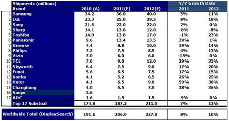 如下表所估計(jì),2011年前十六大品牌之合計(jì)出貨量為1億8,700萬臺(tái),占 2011年全球的出貨的91%,但較2010年前十六大品牌的出貨合計(jì)只成長(zhǎng)了7%,根據(jù) DisplaySearch 的估計(jì)2011年全球液晶電視出貨也只較2010年成長(zhǎng)8%,由此可見主要領(lǐng)導(dǎo)品牌的出貨達(dá)成與全球液晶電視的出貨實(shí)績(jī)息息相關(guān)。