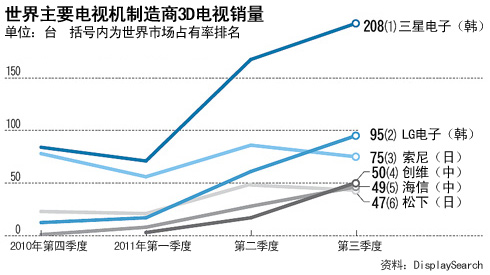 據(jù)市場調(diào)查機(jī)構(gòu)Display Search 20日公布的《第三季度世界3D電視銷量》顯示,中國有4家企業(yè)進(jìn)入前十,分別是創(chuàng)維(50萬臺(tái),第4位)、海信(49萬臺(tái),第5位)、長虹(34萬臺(tái),第7位)、康佳(27萬臺(tái),第9位)。