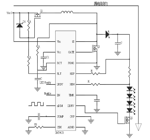 美國國家半導體研發(fā)的LM3423 芯片輸入電壓范圍在4.5V 到75V之間,適用于極寬的輸入電壓范圍;50KHZ 的快速PWM調(diào)光;內(nèi)部基準電壓50mV- 1.25V;工作頻率最大可達到1MHZ;內(nèi)部驅(qū)動能力750mA,超低電流停機小于2uA.可以用來配置升壓、浮動降壓、浮動降壓/ 升壓和SEPIC 拓撲結(jié)構(gòu)中低側(cè)外部MOSFET的控制器;使用峰值電流模式控制器和預測性關(guān)閉時間設(shè)計來調(diào)節(jié)LED 電流,峰值電流模式控制器與預測性關(guān)閉時間設(shè)計的組合簡化了回路補償設(shè)計,同時提供內(nèi)在的輸入電壓前饋補償;設(shè)有用于控制外部調(diào)光FET 和系統(tǒng)"零電流"關(guān)閉特點的集成驅(qū)動器;并且具有LED 狀態(tài)輸出標記、故障標記、可編程故障計時器和邏輯針腳,用于控制調(diào)光驅(qū)動器的極性。