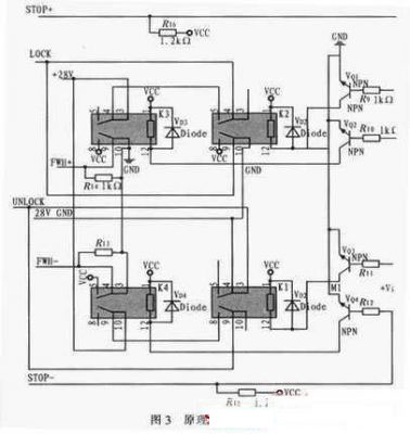 當信號D0-D5為10000時,單片機通過P10口對方位鎖定機構發(fā)出加鎖命令,控制命令經(jīng)SN54LS245驅動后作用于R9和VQ1,VQ1導通后,繼電器K2的4、5導通,輸出+28 VLOCK信號控制電機進行加鎖。完全鎖定后,光電開關輸出(上)信號輸出高電平即圖3中STOP+,STOP+通過上拉電阻R16作用于R10和VQ2,VQ2導通后,繼電器K3的4、5和8、9導通,+28 V LOCK信號切斷,硬件上先停止加鎖控制,防止造成機構硬件損傷。而K3的8、9導通后,F(xiàn)WH+輸出+5 V電平給單片機,單片機接收信號后,終止加鎖命令,VQ1截止,K3恢復常態(tài)。解鎖過程和加鎖過程類似,在此不作贅述。