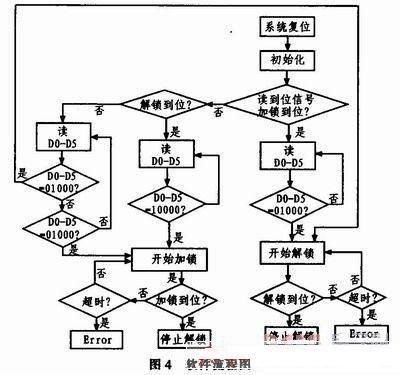 如圖2所示,單片機通過讀取外來信號D0—D5,程序內部判斷后對鎖定機構進行加鎖或解鎖控制,控制信號通過SN54LS245驅動后,控制圖3中繼電器的吸合來控制電機工作。沒有加解鎖控制信號或到位信號輸入時,繼電器K1、K2、K3、K4都處于3、4和9、10導通狀態(tài);當信號控制時,繼電器K1、K2、K3、K4處于4、5和8、9導通狀態(tài)。