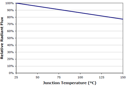 圖3. XLamp7090XR-E的相對(duì)光輸出隨結(jié)溫的升高而降低