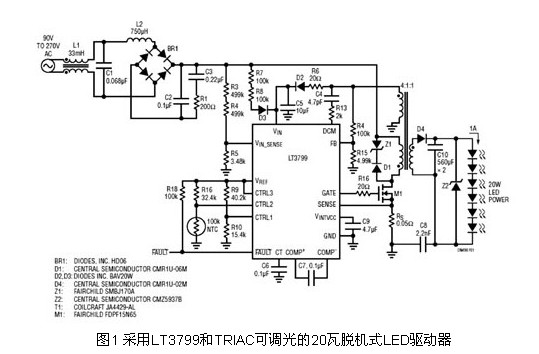 為了滿足脫機(jī)式照明的要求,例如高功率因子、高效率、隔離和TRIAC調(diào)光器兼容性,先前的LED驅(qū)動(dòng)器采用很多外部分立式組件,結(jié)果形成了既龐大又復(fù)雜的解決方案。而最新的驅(qū)動(dòng)器LT3799則整合了脫機(jī)式LED照明需要的所有功能,解決了相關(guān)復(fù)雜性、空間和效能問題。LT3799是一款具主動(dòng)功率因子校正的隔離反馳式LED控制器,專門為在90~265VAC的通用輸入范圍驅(qū)動(dòng)LED而設(shè)計(jì)。該組件以關(guān)鍵導(dǎo)通(邊界)模式控制一個(gè)隔離反馳式轉(zhuǎn)換器,適用于需要4~100瓦或更高LED功率的LED應(yīng)用。其新穎的電流檢測電路無須使用光耦合器,就能向二次側(cè)提供良好調(diào)節(jié)的輸出電流。其獨(dú)特的泄能(Bleeder)電路使得LED驅(qū)動(dòng)器可與TRIAC調(diào)光器兼容,而無須增設(shè)額外的組件。LED開路和短路保護(hù)則可確保長期可靠性。