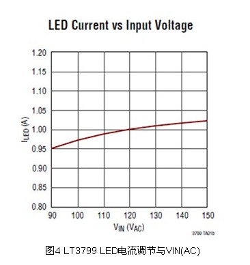 此外,LT3799在整個(gè)輸入電壓、輸出電壓和溫度范圍內(nèi)提供LED電流調(diào)節(jié)。從圖4可見,正如大多數(shù)美國照明應(yīng)用所要求,當(dāng)輸入從90VAC變到150VAC時(shí),LED電流保持在±5%的調(diào)節(jié)范圍內(nèi)。LT3799采用一個(gè)獨(dú)特的電流檢測電路取代了光耦合器,以向二次側(cè)提供良好調(diào)節(jié)的電流。此舉不僅降低了成本,還改善了可靠性。
