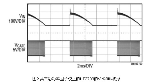 透過使線路電流跟隨施加的正弦波電壓,這種高功能整合的驅(qū)動(dòng)電路實(shí)現(xiàn)了高功率因子,并且滿足了IEC 61000-3-2 C類照明設(shè)備諧波要求。如果所吸取的電流與輸入電壓成正比,就能實(shí)現(xiàn)等于1的功率因子。其用一個(gè)從輸入電壓產(chǎn)生并與輸入電壓成比例的電壓調(diào)制峰值開關(guān)電流。如圖2所示,這種方法提供0.98或更高的功率因子。一個(gè)小帶寬回饋環(huán)路保持對(duì)輸出電流的調(diào)節(jié),而且不會(huì)使輸入電流失真。