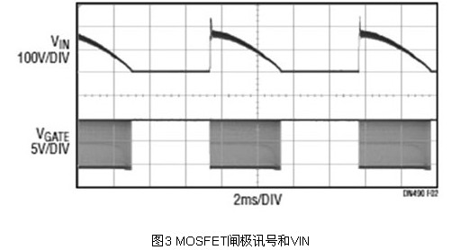 當(dāng)TRIAC調(diào)光器處于斷開狀態(tài)時(shí),其實(shí)不是徹底斷開的。有相當(dāng)大的漏電流通過其內(nèi)部濾波器流至LED驅(qū)動(dòng)器。這個(gè)電流為LED驅(qū)動(dòng)器的輸入電容器充電,進(jìn)而導(dǎo)致LED隨機(jī)開關(guān)和閃爍。過往的解決方案是增加一個(gè)泄能電路,該電路包括一個(gè)大且昂貴的高壓金屬氧化物半導(dǎo)體場效晶體管(MOSFET)。LT3799將變壓器一次側(cè)繞組和主開關(guān)用作泄能電路,因此無需這類MOSFET或其他任何額外的組件。如圖3所示,當(dāng)TRIAC斷開時(shí),MOSFET閘極訊號(hào)為高,且MOSFET接通,進(jìn)而泄放掉漏電電流,并保持輸入電壓為 0伏特(V)。TRIAC一導(dǎo)通,MOSFET就無縫地變回正常的供電組件。