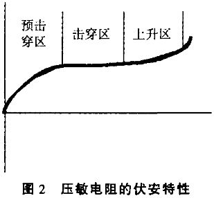 當(dāng)電路中出現(xiàn)雷電感應(yīng)過電壓或瞬態(tài)操作過電壓Vs 時, 保護電路和被保護的設(shè)備(或者線路中的元器件) 同時承受了過電壓Vs ,由于壓敏電阻(保護電路的核心元件) 的響應(yīng)速度快,他以納秒級的時間迅速呈現(xiàn)優(yōu)良的非線性導(dǎo)電特性(圖2 中的擊穿區(qū)) ,使壓敏電阻其兩端的電壓迅速下降,遠(yuǎn)遠(yuǎn)低于Vs 值,有效地將過電壓限制在被保護設(shè)備或被保護元器件的絕緣耐壓值等級下,從而使電子鎮(zhèn)流器免受過電壓的傷害。保證了電子鎮(zhèn)流器不因電源中瞬時過電壓而影響其性能或受傷害。