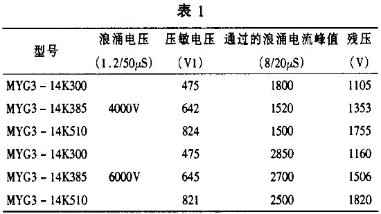 在選擇壓敏電阻器時,要充分考慮電子鎮(zhèn)流器的實際工作環(huán)境因素,滿足線路的安全防護要求。表1 為部分不同型號的壓敏電阻器在不同浪涌電流峰值下的殘壓試驗情況,從表中可以看出,選擇的壓敏電壓值越高,殘壓越高(相同峰值電流情況下) ,同一型號的壓敏電阻器經(jīng)受的峰值電流越大,殘壓也會有所加大。