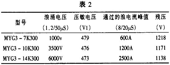 另外,表2 為一組Ф7、Ф10 或Ф14 等不同片徑的壓敏電阻器通流試驗情況,從表中可以看出,對于不同片徑的壓敏電阻器,其所能承受的浪涌電流也不一樣。通常,對于使用同一配方制作的壓敏電阻器,片徑越大,壓敏電阻器能承受的最大峰值電流也就越大,相應(yīng)的殘壓也會有所增加,但其增加的程度遠(yuǎn)遠(yuǎn)低于通流的增加幅度。因此,選型時,應(yīng)根據(jù)線路的耐壓水平,外界可能產(chǎn)生的電涌電壓,盡可能選擇通流比較大的壓敏電阻器,以保證線路長期持續(xù)的正常工作。