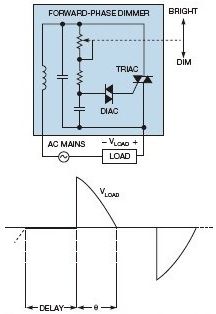 一個標(biāo)準(zhǔn)的正相調(diào)光器包含一個TRIAC、一個DIAC(二極管交流)和一個RC(電阻/電容)電路(圖1)。電位計調(diào)節(jié)電阻值,得到的RC時間常數(shù)用于控制TRIAC導(dǎo)通前的延遲量,或觸發(fā)角。當(dāng)TRIAC導(dǎo)通時,時間部分就是導(dǎo)通角θ。得到的電壓波形就是一個切相的正弦曲線。