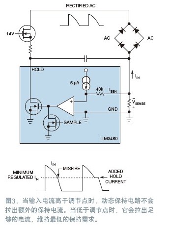 獲得效率最大化的最佳方式是調(diào)節(jié)最低輸入電流。采用這種方法時,當(dāng)輸入電流高于調(diào)節(jié)點時,不會拉出額外的保持電流。當(dāng)輸入電流低于調(diào)節(jié)點時,電路會拉出足夠的電流以維持最小的保持要求,LM3450控制器實現(xiàn)了這種方法,叫做動態(tài)保持(圖3)。它在二極管橋回返以及系統(tǒng)地之間有一只檢測電阻,提供了一種輸入電流的檢測方法。通過電阻上檢測到的電壓,控制器就可以線性地從保持管腳拉出電流,以維持最小的調(diào)節(jié)輸入電流。這樣就確保了額外功耗處于最小值狀態(tài)。